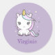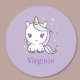 Un autocollant violet avec une mignonne licorne en couleur pastel et un prénom personnalisable à ajouter à toutes vos affaires et vos lettres!
