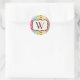Un autocollant monogramme avec un arrière - plan de rangées de points de différentes tailles et des teintes bohème inspirées du rose, violet, orange, bleu et vert. Personnalisez avec votre premier cadre intérieur violet. Recherchez les articles correspondants chez Jill's Paperie.
