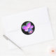 Cette feuille d'autocollants ronds présente une photo d'une fleur sauvage de Pansy. La photo a été colorée artificiellement, ce qui donne un sansy avec des pétales violets rosâtres brillants avec des pétales à pointes vertes et un centre bleu profond. L'arrière - plan est noir pour faire ressortir la fleur.