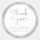 Parties scintillant d'argent confetti & effet de feuille merci texte dans une police tourbillonnant avec place pour votre texte personnalisé sur un autocollant rond. Ces autocollants élégamment simples sont parfaits pour les faveurs de fête, les faveurs de mariage, les douches nuptiales et les scellés d'enveloppe.