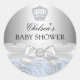Sticker baby shower. Couronne élégante et ruban blanc. Bleu et argent.
