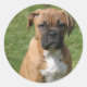 Boxer doux et obéissant assis dans l'autocollant d'herbe.