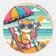 "Rencontrez votre nouveau copain de plage : un chat gingembre froid à l'ombre, siroter une boisson tropicale, et vivre totalement le rêve. Avec ‘I'm Just A Girl' flottant au-dessus, c'est la vibe à purr-fect pour s'amuser au soleil !"