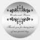 Élégant, personnalisé argent et noir 25e anniversaire Mariage Favoriser les Stickers ronds. Disponible à l'adresse www.zazzle.com/MonogramLogos. Beau arrière - plan en argent métallique (effet photo imprimé) avec un design de tourbillons décoratifs noirs avec espace pour les noms du couple marié (mariée et mariée). Utilisez pour étiquette votre faveur traiter des sacs ou des ballotins. Les champs de modèle permettent deux lignes de texte, y compris un message de remerciement mariage. Pour plus de choix d'édition, utilisez l'option "customiser" pour modifier les couleurs et les styles de police.