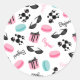 Un autocollant avec un motif de macarons français bleus et roses, des canicules noirs, des lunettes de soleil pour les yeux de chat, des boîtes cadeaux roses attachées à un ruban noir, et "Bonjour !"