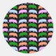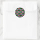 Cet autocollant rond présente une série de cochons de différents types de dessins animés colorés. Les porcs sont en alternance rose et bleu et vert et orange. L'arrière - plan est noir.