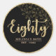 Personnalisé noir et or 80e anniversaire ronde de fête favoriser étiquette pour avec des motifs simples, simulé parties scintillant et écriture manuscrite. Customisé avec le nom, l'année de naissance/la date de naissance, ou des messages courts de votre propre nom.