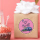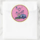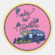 Ready for Adventure est un autocollant de camping classique. Il comprend des oeuvres d'art originales et des mots manuscrits de l'Art of Camping Now. Une remorque de camping classique est l'image principale. La remorque de voyage reflète le paysage montagneux autour du camping.