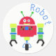 Anniversaire fête préférée autocollant avec des dessins animés colorés d'un robot rouge, vert, jaune et bleu. Le texte bleu pointillé lit Robot et peut être personnalisé. Des fournitures de partie correspondant sont disponibles.