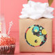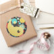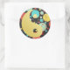 Autocollant rond avec l'image d'un symbole yin et yang qui est mi-or et mi-vintage image des années 1960 de points et cercles colorés dans différentes tailles sur noir. Voir confettis assortis, sac de faveur, étiquette de faveur et papier d'emballage. Voir l'ensemble de la collection Psychedelic Sticker des années 60 dans les INVITATIONS | Section Stickers & Étiquettes.
