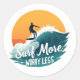 Stick on the good vibes with this "Surf More, Worry Less" sticker! 🏖️ 🏄 ♂️ Un surfeur élégant surfe sur une vague qui s'écrase sous un coucher de soleil orange vif, entouré de formes scintillantes stylisées et d'une typographie de plage fluide. Imprimé sur arrière - plan blanc en turquoise, orange et marine — étanche et haute résolution. Idéal pour les ordinateurs portables, les bouteilles, les planches ou les cadeaux ! 🧡 🌊