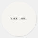 A simple round sticker featuring Take care. This calm, neutral design is suitable for everyday encouragement and thoughtful notes. Ideal for cards, envelopes, planners, and journals. Part of the Everyday Support Series, created for gentle, supportive use.