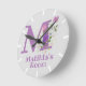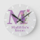 Horloge de la chambre de l'enfant. Le design présente Monogram & Name avec Fleurs de chaque côté dans un style pastel couleur eau. Exemple : Matilda. Changez de nom comme souhaité pour toute personne avec un nom commençant par M. Une heure lumineuse et amusante pour toute chambre d'enfants. Votre enfant appréciera que son nom soit imprimé audacieusement sur le visage de l'horloge.