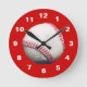 Photographie d'une balle de baseball au centre de l'horloge avec un fond bordeaux et des lettres blanches.