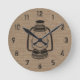 Une horloge avec une illustration toute noire d'une lanterne à huile de style camping sur un arrière - plan inspiré par un burlap.