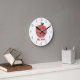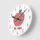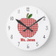 Une horloge pour les enseignants avec une illustration d'une pomme en vichy rouge. Personnalisez avec le nom de votre professeur en rouge.