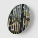 Numéros romains en lettrage blanc sur le dessus de tuyaux d'orgue métal battu en argent, avec des teintes délicates d'or et de vert reflété dans le métal.