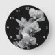 Cette horloge blanche et noire a de jolies orchidées Phalaenopsis qui ont été améliorées, et changées en noir et blanc. La main est gris clair, et les chiffres sont blancs.