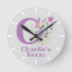 Horloge Des Enfants. Le design présente Monogram & Name avec Fleurs de chaque côté dans un style pastel couleur eau. Le nom de l'exemple est Charlie. Changez le nom comme souhaité pour toute personne ayant un nom commençant par C.