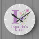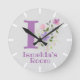 Le design présente Monogram & Name avec Fleurs de chaque côté dans un style pastel couleur eau. Un exemple de nom est Ismelda. Changez de nom comme souhaité pour toute personne avec un nom commençant par I. Kids Bedroom Horloge.