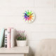 Les couleurs d'une roue de couleur standard sont représentées en feuilles stylisés qui atteignent les chiffres sur la face de l'horloge. L'Arrière - plan est jaune pâle. Deux collections de feuilles colorés (une grande, une plus petite) sont légèrement décalées. Des couleurs chaudes (jaune, orange, rouge) marquent les heures de l'après-midi. Des couleurs cool (rose violet, vert) marquent les heures du soir. Grand cadeau pour l'artiste visuel.