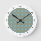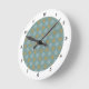 Cette horloge présente un motif de carrelage répétitif en bleu doux et or de l'artiste Jayne Wilson.