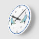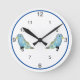 Des oiseaux bleus assis au-dessus des numéros 8 et 4, avec leurs becs pointant vers 9 et 3. Le cercle bleu foncé marque le bord extérieur de la face de l'horloge.