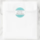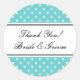 Des autocollants de Merci rond pour les faveurs de mariage. Motif à pois mignon avec texte élégant pour le nom de mariée et de mariée. Peut également être utilisé chez les scellants d'enveloppe fantaisie. Couleur arrière - plan personnalisable en bleu turquoise.