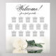 Cette carte moderne à mariages floraux dispose de 16 tables au design romantique, avec un rose en ivoire, blanc ou crème sur son côté, se reflétant dans une piscine d'eau. Le titre, "Bienvenue ! S'il vous plaît Trouvez votre table" est écrit élégamment dans les lettres de calligraphie de script, et il y a suffisamment d'espace en bas pour les noms du couple et la date mariage. Le tableau peut accueillir 160 invités, avec 10 sièges attribués à chaque table, ajoutant élégance, classe et style à votre réception de mariage tout en permettant aux invités de trouver leur siège de manière commode.