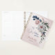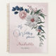Magnifique planificateur de mariage botanique avec des fleurs romantiques roses, blanches et bleues marine avec des feuilles vertes.