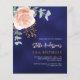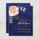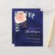 Un arrière - plan bleu marine. La couleur bleue est inégale. Décoré d'un grand or rose et rose vif floral, fleur rose et feuilles d'eucalyptus vert couleur eau, sprigs, verdure et un faux sprig d'or. Personnalisez et ajoutez votre nom et les détails de votre fête. 1 feuille = 1 invite imprimé bord à bord.