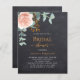 Arrière - plan de tableau de bord. Décoré d'or rose et de fleurs roses rousses, de fleurs roses et de feuilles d'eucalyptus vert aquarellés, de sprigs, de verdure et d'une fausse feuille d'or. Personnalisez et ajoutez le nom de la mariée à être et les détails du parti. Texte blanc et doré. 1 feuille = 1 invite imprimé bord à bord.