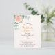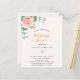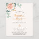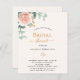 Arrière - plan de couleur crème et rousse. Décoré d'or rose et de fleurs roses rousses, de fleurs roses et de feuilles d'eucalyptus vert aquarellés, de sprigs, de verdure et d'une fausse feuille d'or. Personnalisez et ajoutez le nom de la mariée à être et les détails du parti. Lettres noires et dorées. 1 feuille = 1 invite imprimé bord à bord.