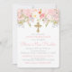 Une invitation simple et délicate pour la première sainte communion de votre enfant, le baptême, ou la confirmation avec des fleurs florales roses, des roses et une fausse parties scintillant d'or croix. Les détails sont faciles à modifier pour s'adapter à votre événement. Les articles correspondants pour cette collection peuvent être trouvés dans notre boutique de la Collection Jardin Rose.