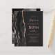 Le bord gauche de cette élégante invitation moderne pour un 50e anniversaire présente une bordure d'agate à l'aquarelle noire rehaussée de faux strass en rose gold. Le texte personnalisable combine une écriture manuscrite couleur rose, des polices copperplate et italiques sur un fond noir ardoise. Le verso présente un motif assorti d'agate noir et rose gold.