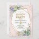 Élégante invitation à la fête de graduation avec cadre géométrique en faux or orné de succulents d'aquarelle, de fleurs roses et de feuillage vert
