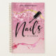 Manuel de rendez-vous d'affaires/planificateur de technicien d'ongles moderne, branché, brillant. Le design présente un arrière - plan chic et brillant dans les couleurs d'or rose et rose, pinceau vernis à ongles et icône de bouteille, clous de script typographique dans le lettrage noir. Personnalisez avec votre nom sur le devant et les détails sur le dos.