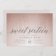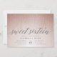 Les somptueuses invitations en sweet sixteen d'or rose présentent un arrière - plan à l'ombre rose vif avec des cordes verticales de lumières en feuille d'or rose brillantes. "Sweet sixteen" apparaît sous la typographie de script de calligraphie chic. Personnalisez avec vos 16 détails sucrés sous le gris élégant.