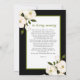 Cette conception de prière mémorielle romantique présente des roses blanches aquarelles et un feuillage vert sur fond noir avec un texte élégant vert et noir. Ajoutez une photo dans un cadre de verdure. Le verso de la carte de poème est de couleur noire simple avec des fleurs blanches chic, un cadre de verdure avec texte de prière.