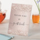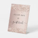 Un arrière - plan métallique à l'aspect faux rose d'or avec fausse parties scintillant. Avec le texte : Veuillez signer le livre d'or.