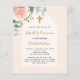 or rose, arrière - plan en arc de cercle, décoré d'un rose, végétation d'eucalyptus et d'une croix d'or. Personnalisez et un nom et des détails de la cérémonie. Lettres noires et dorées. Retour : arrière - plan rose d'or. 1 feuille = 1 invite imprimé bord à bord.