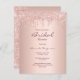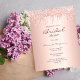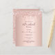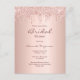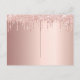 Devant : Un arrière - plan rose en or. Décoré avec de l'or rose, des gouttes roses, l'air de la goutte de peinture. Modèles pour le nom de la mariée et les détails du parti. Le nom et le texte : Mariée sont écrits avec un script de style écrit main, des lettres de couleur noire. Retour : arrière - plan rose en or avec gouttes. Conseil : Si vous ne voulez pas qu'il ressemble à une carte postale, cliquez sur customiser, allez à l'arrière et retirez le séparateur et le timbre postal.