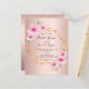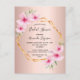 Une élégante invitation à la nuptiale tropicale estivale. Avec un cadre géométrique en faux or décoré d'hibiscus rose pâle, fleurissent des fleurs tropicales avec un peu de verdure. Un arrière - plan rose à l'apparence métallique. Le nom de la mariée à être est écrit avec un script de style manuel moderne. Texte noir. Dos : faux rose or arrière - plan métallique. Conseil : Si vous ne voulez pas qu'il ressemble à une carte postale, cliquez sur customiser, allez à l'arrière et retirez le séparateur et le timbre postal.