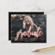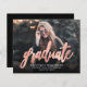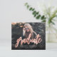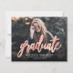 Faire-part moderne de graduation avec photo horizontale personnalisée. Le mot "diplômé" apparaît dans le script rose de faux feuille d'or, avec le nom du diplômé, l'école et l'année de graduation en bas en blanc sans serif police. Remplacez facilement l'image de l'échantillon par la photo de votre diplômé. Un écran de dégradé noir permet de s'assurer que le texte s'affiche. L'inverse est noir. Idéal pour obtenir un diplôme d'études secondaires ou collégiales.