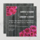Un faire-part de mariage avec une photo arrière - plan de bois patiné de grange. Photos de bouquets de roses chaudes aux coins supérieur gauche et inférieur droit. Personnalisez le texte correspondant avec les détails de votre événement. L'arrière est orné d'un arrière - plan en bois d'écorce.