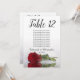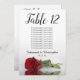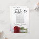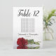 Ces belles cartes de numéro de table faciliteront la recherche de sièges à votre réception de mariage. Elles présentent un design simple mais élégant avec des lettres de calligraphie script et une seule rose rouge à long tige allongée sur son côté réfléchissant dans l'eau. La carte comprend un tableau de sièges avec 10 noms. Il y a aussi de la place pour les noms du couple et la date du mariage. Cette carte est disponible dans une variété de tailles et est plus grande que nos cartes de numéro de table standard.
