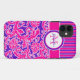 Ce Coque moderne, personnalisé, rose chaud, violet et blanc rayures avec motif à damas floral Coque-Mate Barely There™ iPhone 5 a des points pour vous d'ajouter votre nom et monogramme. Si vous avez besoin d'aide pour customiser ceci, veuillez envoyer un courriel à niteowlstudio@gmail.com.