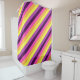 Un rideau de douche avec un design motif mignon et coloré de rayures diagonales en prune violet, lavande, jaune citron, orange melon et magenta lumineux.