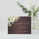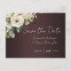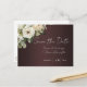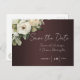 Nous vous présentons nos charmantes cartes de faire-part de mariage "White Roses on Burgundy Boho Wedding Save the Date" rustiques et élégantes, le moyen idéal de préparer votre grand jour romantique et stylé. Avec de belles roses blanches disposées artistiquement sur un fond bordeaux, ces cartes de faire-part de mariage bohèmes trouvent le juste équilibre entre l'élégance classique du mariage et le style chic moderne. Le design floral, associé à une typographie sophistiquée, crée une atmosphère accueillante et intemporelle que vos invités adoreront. Chaque carte est imprimée sur du papier cartonné de haute qualité et écologique, et fait partie d'une suite de papeterie assortie, assurant une cohérence visuelle pour vos célébrations de mariage. Faites passer le mot et partagez votre date spéciale avec ceux que vous aimez le plus avec ces captivantes cartes de faire-part de mariage bordeaux.
