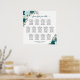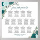 Vous cherchez un étonnant tableau de sièges pour votre réception de mariage ? Ne cherchez pas plus loin ce magnifique design, avec des roses d'aquarelle peints à la main dans les tons turquoises, turquoise, aqua et cyan, entouré de luxuriants feuilles d'eucalyptus et de verdure du jardin. Avec un espace de 130 noms sur 13 tables de 10 places chacune, ce tableau de sièges est parfait pour une gamme de tailles mariages. L'élégante calligraphie de script ajoute une touche de sophistication, et il y a de la place pour les noms du couple et la date mariage en bas. Que votre mariage soit formel ou décontracté, ce beau tableau chic boho vous offre un équilibre parfait entre rustique et classe, ce qui en fait un lieu idéal pour toute célébration.